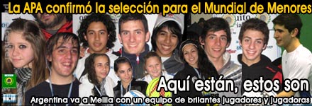 (Buenos Aires, 15/9/2011. APA para Padelcenter.com) La Asociación de Padel Argentino informa que tras la convocatoria oficial efectuada el 24 de agosto último han quedado designados para integrar el equipo Oficial de Menores que nos representará en el “VII Campeonato Mundial de Menores” a disputarse entre los días 17 al 22 de octubre del corriente año, en la ciudad de Melilla, España, los siguientes jugadores:
