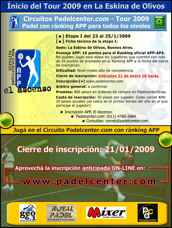 (Buenos Aires, 31/12/2008. De la Redacción de Padelcenter.com) Luego del impresionante cierre de la temporada 2008 con el marco del Master y sus excelentes partidos que pusieron en lo más alto a Ale Pardini/Pali Castro y Diego Tórtora/Javi Reiter, llega la temporada 2009 confirmando dos etapas, una en La Eskina de Olivos, del 23 al 25 de enero y otra en el blindex del Grupo.Padelcenter instalado en un balneario de Villa Gesell, entre el 6 y el 8 de febrero.