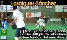 (Laboulaye, 11/7/2010. Redacción de Padelcenter.com) Con el triunfo sobre Damián Diez y Jaime Serrano en primer turno por 1/6 6/1 6/3, la pareja 1 del torneo integrada por los históricos Maru Lasaigues y el rosarino Damián Sanchez se aseguró un lugar en la final, donde se verá exigida por Luciano Soliverez y el cordobés Jorge "Poroto" Pérez, quienes en segundo turno eliminaban al porteño Diego Cipriano y el misionero de Puerto Iguazú Adrián Pérez por 6/3 7/5.