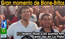 (Buenos Aires, 8/11/2010. Redacción de Padelcenter.com) El año de Lisandro Bione y Andres Britos ya venía bien y no podía tener un mejor final. Con su triunfo ante Leo Santomassimo y Pablo Pelassini por 5/7 6/0 6/1, se coronaron en una nueva etapa de 60 puntos APP y se ubicaron como una de las parejas animadoras del segmento del puesto 30 para abajo del Ranking APP.