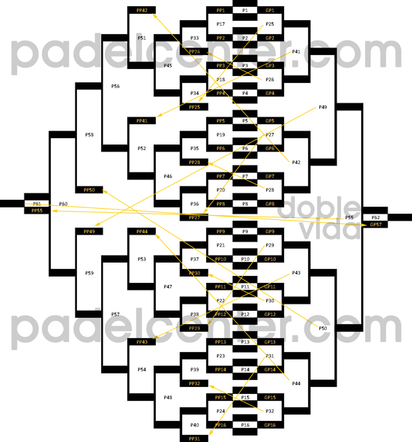 // Sistema doble eliminación: la pareja que pierde pasa a cuadro de perdedores, cuyo ganador disputa la final contra el ganador del cuadro principal.