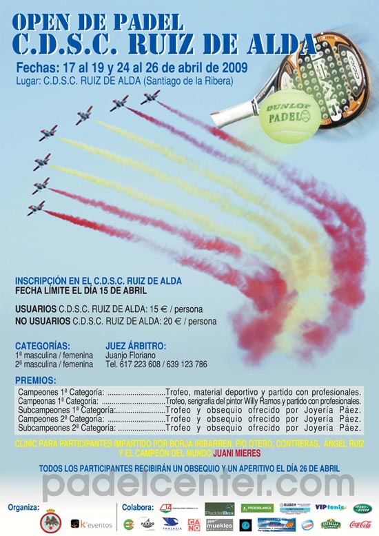 (Santiago de la Ribera, Murcia, 8 de abril de 2008. Inmaculada Lopez para Padelcenter.com) A partir del 17 de abril se disputará el Open de Padel en el Centro Deportivo Sociocultural Ruiz de Alda (Club de oficiales, ejército del aire), en Santiago de la Ribera, Murcia. También se realizará un clinic impartido por el profesional y campeón mundial con España en Canadá 2008 Juan José (Juani) Mieres.