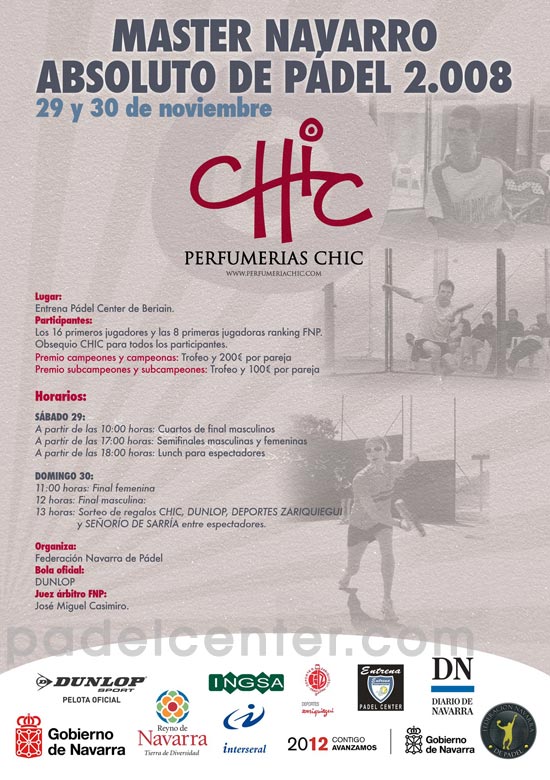 Los próximos días 29 y 30 de noviembre tendrá lugar el MASTER NAVARRO 2.008 – PERFUMERIAS CHIC en el “Entrena Pádel Center” de Beriain con la participación de los 16 primeros jugadores y las 8 mejores jugadoras del actual ranking oficial de la Federación Navarra de Pádel.