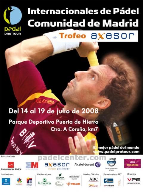 Madrid, 8 de julio de 2008. Del 14 al 19 de julio el Parque Deportivo Puerta de Hierro se convertirá en la sede de la prueba que marca el ecuador del Padel Pro Tour (PPT), considerado el mejor circuito de pádel profesional del mundo. Los Internacionales de Pádel Comunidad de Madrid Trofeo Axesor permitirán a los madrileños disfrutar con la élite de este deporte, y es que las veinte mejores parejas del panorama internacional tienen garantizada su presencia en la disputa de esta prueba.