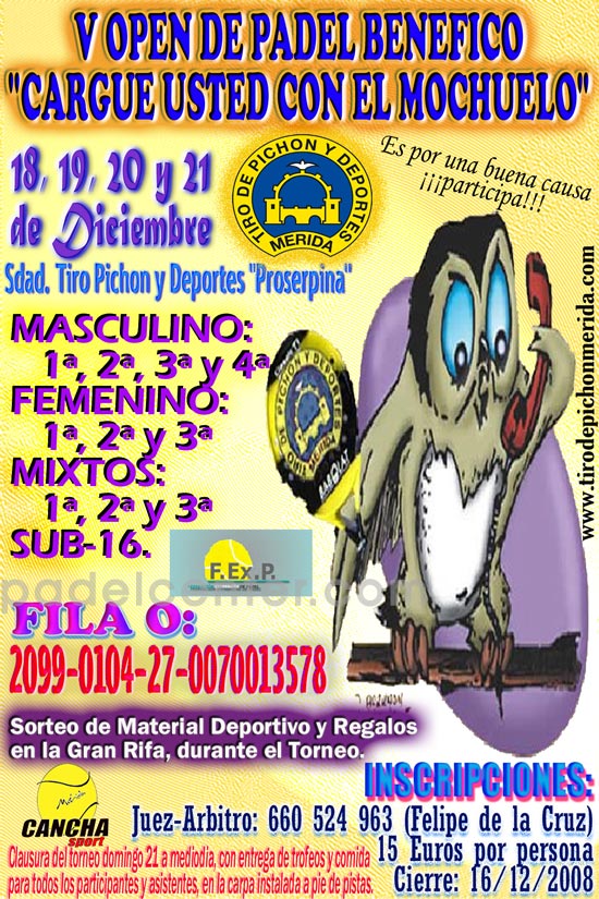 (Mérida, 3 de diciembre de 2008. Sociedad TdPyD Proserpina para Padelcenter.com) Durante los días 18, 19, 20 y 21 del presente mes de diciembre, se celebrará en la Sociedad Tiro de Pichon y Deportes "Proserpina" de Mérida, el tradicional Open de Padel Benéfico "Cargue Usted con el Mochuelo", en su quinta edición consecutiva. Dicho Open se dividirá en las siguientes categorías: