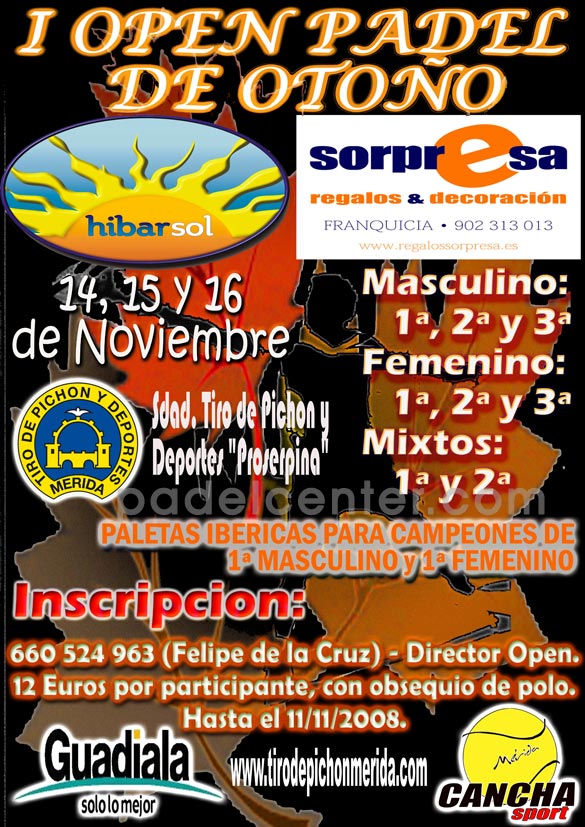 (Mérida, 12 de noviembre de 2008. Sociedad TdPyD Proserpina para Padelcenter.com) Nuevo torneo a celebrarse en la Sociedad Tiro de Pichón y Deportes "Proserpina" de Mérida, denominado "I Open de Padel de Otoño Hibarsol-Regalos Sorpresa", tendrá lugar durante los días 14, 15 y 16 del presente mes, pudiendose inscribir en el mismo todas las parejas interesadas, hasta el 11/11/2008, en el teléfono 660 524 963 (Felipe de la Cruz - Director del Open), componiendo dicho torneo, las siguientes categorías: