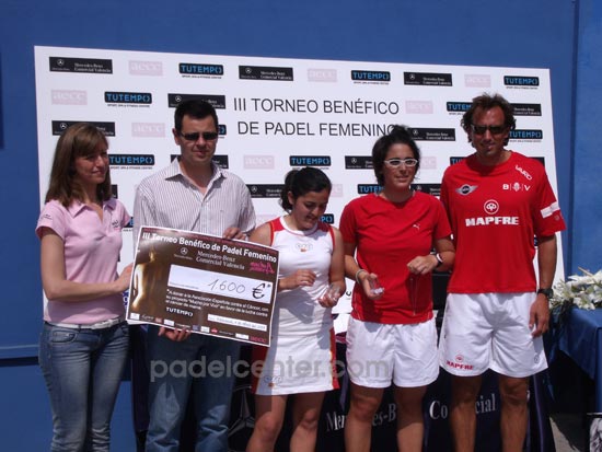 El III Torneo Benéfico de Pádel Femenino congregó a un colectivo de mujeres que por un día no le dieron la espalda a una enfermedad que les es propia. Que se dieron cita en una jornada matinal de primavera para jugar un torneo de pádel. Sólo fue un gesto. Un encuentro que recogió 1.600 euros, los cuales fueron donados por las campeonas del mismo al subdirector de la AECC en Valencia, Javier Llombart.
