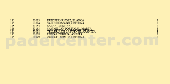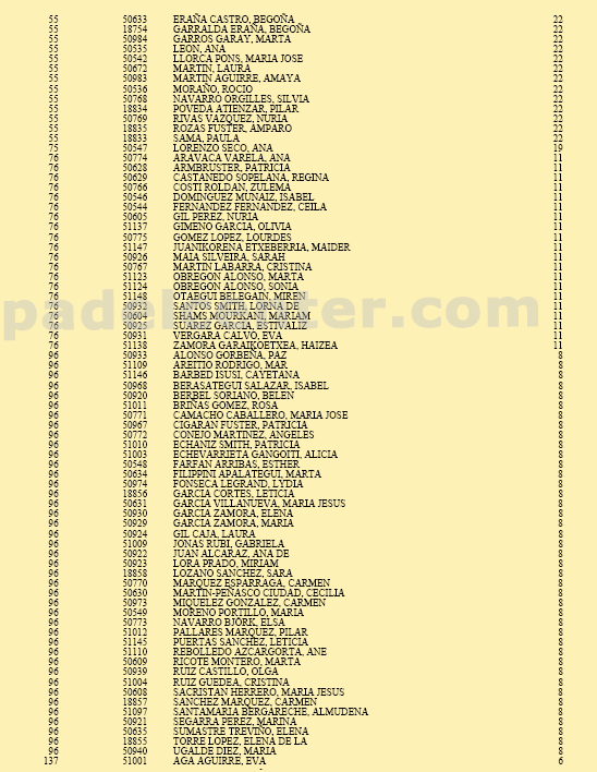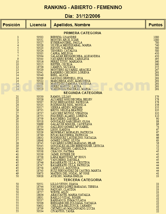 RANKING - ABIERTO - FEMENINO Día: 31/12/2006 Posición Licencia Apellidos, Nombre Puntos PRIMERA CATEGORIA 1 50502 BERWIG, LISANDRE 1080 1 50531 MONTES ARCE, ICIAR 1080 3 50527 EYHERAGUIBEL, PAULA 780 4 50528 SILVELA MENDIZABAL, MARIA 740 5 50523 PAVON, VALERIA 580 5 50524 TENORIO, CATALNA 580 7 50505 CAPRA, MELISSA 450 7 50504 SALAZAR BENGOECHEA, ALEJANDRA 450 9 50543 NAVARRO BJÖRK, CAROLINA 395 10 50516 PEREZ TITOY, MARIANA 360 10 50515 REITER, CECILIA 360 12 18736 CAMPUS, SILVANA 355 13 50520 MONTERO ALVAREZ, ARACELI 247 14 50541 BARBERO CHICHON, LORENA 201 14 50540 BERL, ALICIA 201 14 50509 GAYOSO ORPINELL, EVA 201 14 50522 MARCHENA ASIN, ALMUDENA 201 14 50508 MARTINEZ ZAMORA, VANESSA 201 14 50521 PEREZ MARTIN, LAURA 201 14 50519 WAKONIGG FIGUERAS, MARIA 201 SEGUNDA CATEGORIA 21 50530 RAMOS, LILIAN 179 22 50526 ALVAREZ GOICOECHEA, BELEN 178 22 50507 RUIZ HERNANDEZ, PATRICIA 178 24 50525 RODRIGUEZ RIOL, MONICA 156 25 50517 SIERRA ARDEN, MIRIAM 155 26 18735 BRITO, NELIDA BEATRIZ 135 27 18737 SANCHEZ MUÑOZ, VIRGINIA 132 28 18755 FIGUERES ALARIO, LORENA 110 29 18759 BANCHERO, DANIELA 90 30 50518 GONZALEZ GARCERAN, OLGA 88 31 50669 GALAZ DE MIGUEL, CAYETANA 86 32 18733 GALLEGO GOMEZ, Mª ISABEL 74 33 50934 LEON, KARINA 67 33 50529 MOWBRAY MORALES, PATRICIA 67 35 18740 RIVAS BASTERRA, PATRICIA 66 35 18832 RODRIGUEZ LAUDELINO, NATALIA 66 37 18848 GOMEZ LOPEZ, SILVIA 63 38 18745 NAVARRO LOPEZ-BARAJAS, PILAR 56 39 50545 GONZALEZ-ALLER BERENGUER, LETICIA 52 39 50610 PRADO CRESPO, CAROLINA 52 41 50538 CHACON, FATIMA 45 41 50539 JAIME, ESTHER DE 45 41 18738 LARA MARTINEZ, Mª JESUS 45 41 50927 VANCHERO, DANIELA 45 45 18746 BASARRATE CILLA, CRISTINA 44 45 18747 BASARRATE CILLA, PATRICIA 44 45 18758 CAPPUCCI, AGUSTINA 44 45 18743 RUIZ FERNANDEZ DE CASTRO, MARTA 44 49 50673 MATEOS DEL NOZAL, Mª JOSE 41 50 50928 AYECHU, MARIA EMILIA 33 TERCERA CATEGORIA 50 50551 LILLO VITON, DIANA 33 50 18744 NAVARRO LOPEZ-BARAJAS, TERESA 33 50 50550 PADUAN, CLAUDIA 33 50 18757 WIRTH, AILIN 33 55 18836 ABASTANTE, MARIA NATALIA 22 55 18831 BAELLO VIDAL, ROSER 22 55 50537 BARRANCO, INMACULADA 22 55 50506 BERGARECHE ZULOAGA, NATALIA 22 55 50632 CHILLIDA BELZUNCE, CARMEN 22 55 18739 CHUMILLAS MALDONADO, LUCIA 22 55 50534 CIVANTOS, TANIA 22 Página: 1 55 50633 ERAÑA CASTRO, BEGOÑA 22 55 18754 GARRALDA ERAÑA, BEGOÑA 22 55 50984 GARROS GARAY, MARTA 22 55 50535 LEON, ANA 22 55 50542 LLORCA PONS, MARIA JOSE 22 55 50672 MARTIN, LAURA 22 55 50983 MARTIN AGUIRRE, AMAYA 22 55 50536 MORAÑO, ROCIO 22 55 50768 NAVARRO ORGILLES, SILVIA 22 55 18834 POVEDA ATIENZAR, PILAR 22 55 50769 RIVAS VAZQUEZ, NURIA 22 55 18835 ROZAS FUSTER, AMPARO 22 55 18833 SAMA, PAULA 22 75 50547 LORENZO SECO, ANA 19 76 50774 ARAVACA VARELA, ANA 11 76 50628 ARMBRUSTER, PATRICIA 11 76 50629 CASTANEDO SOPELANA, REGINA 11 76 50766 COSTI ROLDAN, ZULEMA 11 76 50546 DOMINGUEZ MUNAIZ, ISABEL 11 76 50544 FERNANDEZ FERNANDEZ, CEILA 11 76 50605 GIL PEREZ, NURIA 11 76 51137 GIMENO GARCIA, OLIVIA 11 76 50775 GOMEZ LOPEZ, LOURDES 11 76 51147 JUANIKORENA ETXEBERRIA, MAIDER 11 76 50926 MAIA SILVEIRA, SARAH 11 76 50767 MARTIN LABARRA, CRISTINA 11 76 51123 OBREGON ALONSO, MARTA 11 76 51124 OBREGON ALONSO, SONIA 11 76 51148 OTAEGUI BELEGAIN, MIREN 11 76 50932 SANTOS SMITH, LORNA DE 11 76 50604 SHAMS MOURKANI, MARIAM 11 76 50925 SUAREZ GARCIA, ESTIVALIZ 11 76 50931 VERGARA CALVO, EVA 11 76 51138 ZAMORA GARAIKOETXEA, HAIZEA 11 96 50933 ALONSO GORBEÑA, PAZ 8 96 51109 AREITIO RODRIGO, MAR 8 96 51146 BARBED ISUSI, CAYETANA 8 96 50968 BERASATEGUI SALAZAR, ISABEL 8 96 50920 BERBEL SORIANO, BELEN 8 96 51011 BRIÑAS GOMEZ, ROSA 8 96 50771 CAMACHO CABALLERO, MARIA JOSE 8 96 50967 CIGARAN FUSTER, PATRICIA 8 96 50772 CONEJO MARTINEZ, ANGELES 8 96 51010 ECHANIZ SMITH, PATRICIA 8 96 51003 ECHEVARRIETA GANGOITI, ALICIA 8 96 50548 FARFAN ARRIBAS, ESTHER 8 96 50634 FILIPPINI APALATEGUI, MARTA 8 96 50974 FONSECA LEGRAND, LYDIA 8 96 18856 GARCIA CORTES, LETICIA 8 96 50631 GARCIA VILLANUEVA, MARIA JESUS 8 96 50930 GARCIA ZAMORA, ELENA 8 96 50929 GARCIA ZAMORA, MARIA 8 96 50924 GIL CAJA, LAURA 8 96 51009 JONAS RUBI, GABRIELA 8 96 50922 JUAN ALCARAZ, ANA DE 8 96 50923 LORA PRADO, MIRIAM 8 96 18858 LOZANO SANCHEZ, SARA 8 96 50770 MARQUEZ ESPARRAGA, CARMEN 8 96 50630 MARTIN-PEÑASCO CIUDAD, CECILIA 8 96 50973 MIQUELEZ GONZALEZ, CARMEN 8 96 50549 MORENO PORTILLO, MARIA 8 96 50773 NAVARRO BJÖRK, ELSA 8 96 51012 PALLARES MARQUEZ, PILAR 8 96 51145 PUERTAS SANCHEZ, LETICIA 8 96 51110 REBOLLEDO AZCARGORTA, ANE 8 96 50609 RICOTE MONTERO, MARTA 8 96 50939 RUIZ CASTILLO, OLGA 8 96 51004 RUIZ GUEDEA, CRISTINA 8 96 50608 SACRISTAN HERRERO, MARIA JESUS 8 96 18857 SANCHEZ MARQUEZ, CARMEN 8 96 51097 SANTAMARIA BERGARECHE, ALMUDENA 8 96 50921 SEGARRA PEREZ, MARINA 8 96 50635 SUMASTRE TREVIÑO, ELENA 8 96 18855 TORRE LOPEZ, ELENA DE LA 8 96 50940 UGALDE DIEZ, MARIA 8 137 51001 AGA AGUIRRE, EVA 6 Página: 2 137 50971 AGUIRRE MARURI, LEIRE 6 137 51002 ANGULO PEÑA, ROSARIO 6 137 50980 CANDELA DELGADO, ANA 6 137 51157 DIAZ MORENO, ARANTXA 6 137 51119 DIEZ APRAIZ, ESTIBALIZ 6 137 51142 GALILEA MARTINEZ, CARLA 6 137 51120 GARROS GARAY, SUSANA 6 137 50992 GOMEZ BILBAO, ALMUDENA 6 137 50991 LARUMBE ESPINOSA, GEMMA 6 137 51158 LECEA, AMAYA DE 6 137 51141 LEIBA MARTIN, Mª DEL MAR 6 137 51152 MAGUIRE, FIONA 6 137 51151 OLANO IRIARTE, NEREA 6 137 50972 PASTOR MARTIN, ROCIO 6 137 50979 URRUTIA SAN ANTON, MAITENA 6 153 51117 ADAN GARCIA, TERESA 4 153 51125 ALONSO MORAL, CARMEN 4 153 51098 ARBOLI RODRIGUEZ, LUCIA 4 153 51121 BASTERRA ARREGUI, ALMUDENA 4 153 51163 BIKARREGUI ESPARTA, ITZIAR 4 153 51101 CABALLERO REY, CARMEN 4 153 50964 CRUZAT ESCAURIAZA, ADRIANA 4 153 51116 EGUIDAZU BENGOA, ANA 4 153 50966 EGUIDAZU MAYOR, PALOMA 4 153 50987 ELEXPURU EGUIA, ISABEL 4 153 50988 ESCONDRILLAS WENCEL, TERESA 4 153 51100 FERNANDEZ DE LARREA, MARIAN 4 153 51161 GANCEDO VILDOLSOLA, ELENA 4 153 51159 GARCIA BALDASANO, ICIAR 4 153 51164 LARRINAGA URIBARRI, ITZIAR 4 153 50963 LECEA GRAVALOS, CAMINO DE 4 153 50993 LEJAUZA REGULEZ, 
