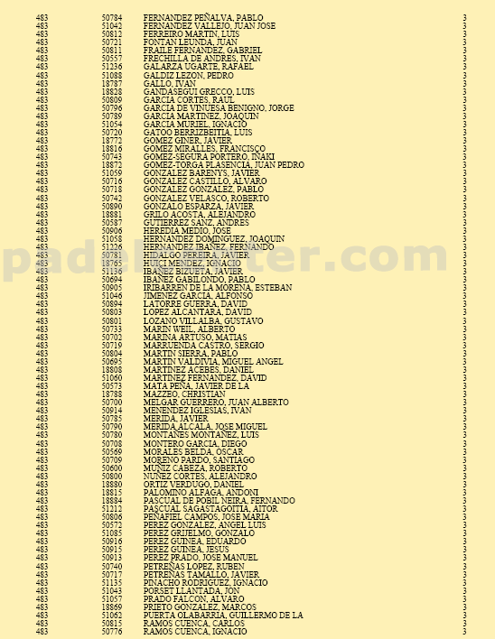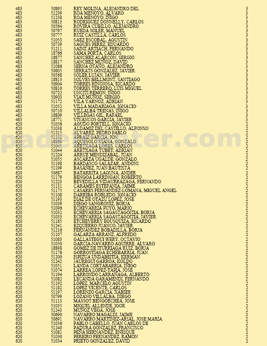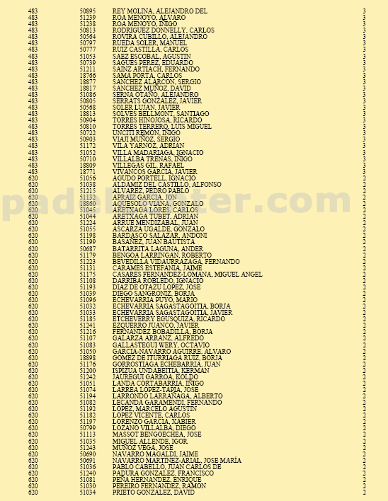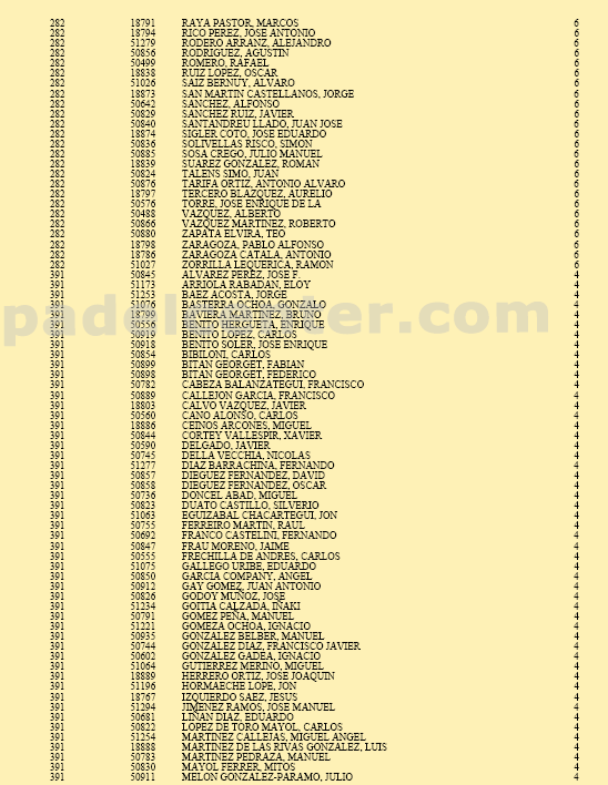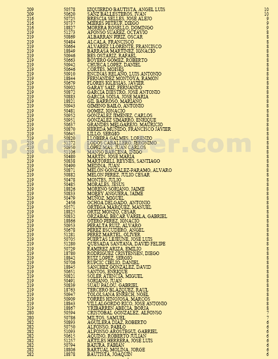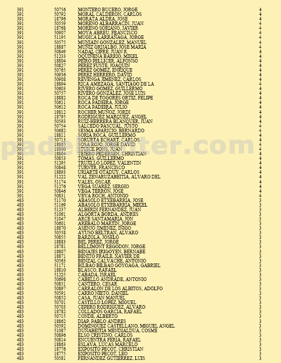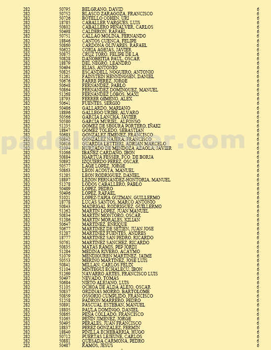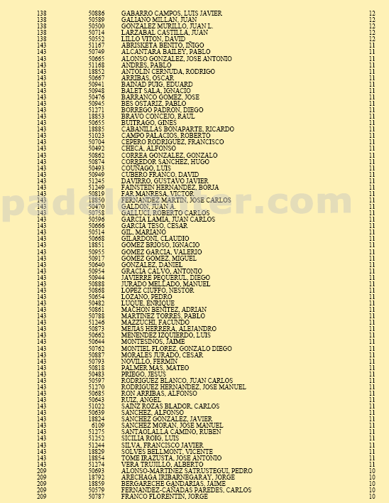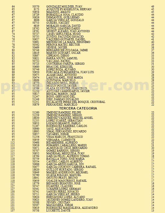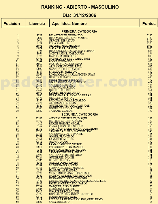 RANKING - ABIERTO - MASCULINO Día: 31/12/2006 Posición Licencia Apellidos, Nombre Puntos PRIMERA CATEGORIA 1 9723 BELASTEGUIN, FERNANDO 2160 1 7862 DIAZ MARTINEZ, JUAN MARTIN 2160 3 9619 NERONE, SEBASTIAN 1520 3 8174 RECA, GABRIEL 1520 5 16078 GRABIEL, MAXIMILIANO 1080 5 16079 MALACALZA, GASTON 1080 7 9724 DIAZ SANGIORGIO, MATIAS FERNAN 894 7 3054 MONTES ARCE, JOSE MARIA 894 9 8175 GATTIKER, ROBERTO 800 9 50461 MONGELO DE LIMA, PABLO JOSE 800 11 15149 POGGI, FERNANDO 675 11 16050 PRATTO VIDAL, GUSTAVO 675 13 3304 ARIAS HERNANDEZ, RAUL 602 13 17897 NANNI TOLEDO, RAMIRO 602 15 8187 LASAIGUES, MARIANO 540 15 15365 ROMAGOSA DI CARLANTONIO, JUAN 540 17 50460 DERITO, GERARDO 493 18 50584 PEREZ MILLAN, FEDERICO 470 19 15794 DIAZ SANGIORGIO, GONZALO 424 19 15334 SANCHEZ, DAMIAN 424 21 50510 CAPITANI, MARCELO 254 21 50462 QUILES, FEDERICO 254 23 16072 FLORES, HERNAN LUCIO 242 24 7036 HERAS BARAJA, RICARDO DE LAS 231 24 50473 NICOLETTI, MATIAS 231 24 8157 PADOVANI SOSA, LEONARDO 231 27 50472 ALLEMANDI, ADRIAN 220 27 8520 GUTIERREZ VICARIO, JUAN JOSE 220 29 50565 GOMEZ SILINGO, AGUSTIN 209 30 50660 TAMAME, GERMAN 198 SEGUNDA CATEGORIA 31 50582 ANGULO CRISTELLYS, IÑAQUI 187 32 18730 BIGLIERI GUIDET, ADRIAN 179 33 212 INGLES JIMENEZ, OSCAR 176 34 5369 PINNA AREVALO, ENRIQUE 165 35 18732 CASTAÑON LABATSUZAN, GUILLERMO 154 36 50730 SANCHEZ AGUERO, MAXIMILIANO 146 36 50731 SANDOVAL ZOTTI, DANIEL 146 38 50763 GOMES, FRANCISCO 144 38 50764 LAMPERTI, MIGUEL 144 40 50511 GAUNA, DARIO 132 40 2334 LAMAS SANCHEZ, VICTOR 132 40 18818 RODRIGUEZ, JUAN MANUEL 132 43 7361 BLANCO DE MIGUEL, JACOBO 121 43 3889 SANMARTI BELETA, ENRIC 121 43 50598 SANTANA FERRERO, ADAY 121 46 50724 GUTIERREZ, DANIEL 118 47 50586 BRINER, GUSTAVO 115 48 3301 GARCIA LOPEZ, JAVIER 110 48 50599 MUÑOZ BAIXAS, JORDI 110 50 18731 FERNANDEZ DIAZ, MANUEL 99 51 6389 HAMMER, ALEJANDRO 88 51 18728 MONTERDE PLANAS, FRANCISCO 88 51 3362 MORENO ALBARRACIN, EDUARDO 88 54 50618 HERNANDEZ LOPEZ, ANTONIO 78 55 7442 GUTIERREZ DEL ALAMO CABELLO, JOSE LUIS 77 55 11831 IGLESIAS ODERIZ, FCO. PABLO 77 57 50734 VAZQUEZ, JUAN MANUEL 75 58 50585 CERETANI, GABRIEL 74 59 50617 UGARTE REBOLLO, LUIS 56 60 50127 GONZALEZ FERNANDEZ, FEDERICO 55 60 50512 MARIN ARJONA, ALEX 55 60 8519 RUIZ DE LA HERRAN SOLANO, GUILLERMO 55 60 18822 SABA, ROBERTO 55 Página: 1 64 50570 GONZALEZ MOLINER, IVAN 49 65 8173 AUGUSTE EVANGELISTA, HERNAN 45 65 50658 MAZZONI, AMATO 45 67 18729 BOBADILLA SOSA, CLAUDIO 44 67 50626 DEMIANIUK, GUILLERMO 44 67 8896 GARCIA VERICAT, GONZALO 44 67 50753 GUEDES, NAUZET 44 67 6819 MORALES GARCIA, DAVID 44 67 18762 MUÑOZ, LEANDRO DARIO 44 67 18761 SENENT ALFARO, JUAN ANTONIO 44 74 50727 CASES SEPULVEDA, HUGO 42 74 50735 ZUNINO, FACUNDO IGNACIO 42 76 50627 VAQUERO GUITARTE, DANIEL 41 77 50661 MENDEZ DE LA MAZA, JERONIMO 40 78 50562 PERONA MATEU, HECTOR 39 79 50469 SENESE, JAVIER 38 80 50748 BERGARECHE ZULOAGA, JAIME 37 81 18819 MARTIN GUINART, OSCAR 36 82 50867 CIPRIANO, DIEGO 33 82 50621 PARRA SOUTO, SAMUEL 33 82 50732 VAS LEAS, PATRIC 33 85 50723 CONTRERAS FARIÑA, SERGIO 31 86 50680 BRACCHI, EZEQUIEL 30 86 50746 LOPEZ ROZA, ALVARO 30 88 50650 FORCADA ZUBIZARRETA, JUAN LUIS 29 89 50475 ALGAR DIAZ, ANTONIO 28 89 50474 LAGUNA AMIL, JOSE MARÍA 28 89 18868 QUINTANA, MARCELO 28 92 18770 DELGADO MOLL, PABLO 23 92 50728 MOZUN PONCE, JAVIER 23 92 18769 PLAZA SILVESTRE, FRANCISCO 23 95 51250 ANTUNEZ CAMPODARVE, JAVIER 22 95 50817 BENZAL MAHON, JAKE 22 95 51247 BONO, GERVASIO DEL 22 95 51248 DIEZ, DAMIAN OSVALDO 22 95 51251 ESCALANTE PEREZ DEL BOSQUE, CRISTOBAL 22 95 50879 FERNANDEZ, MARCELO 22 TERCERA CATEGORIA 95 51260 JIMENEZ RAMIREZ, FELIPE 22 95 51259 JIMENEZ RAMIREZ, SERGIO 22 95 18830 JIMENEZ VAZQUEZ, MIGUEL ANGEL 22 95 51255 LOPEZ SUAREZ, SEBASTIAN 22 95 50653 LOZANO BEAMUD, PABLO 22 95 51267 RODRIGUEZ RAMIREZ, CARLOS 22 95 50960 SANZ, ALEJANDRO 22 95 18895 SIMAL FERNANDEZ, EDUARDO 22 95 50657 TAVARES, JORGE 22 95 51256 VEGA MARCOS, FRANCISCO 22 95 50959 VERGARA, CLEMENTE 22 112 50468 BIDABEHERE, ALFREDO 21 112 50656 POMARES CABALLERO, MARIO 21 114 50471 ALMONACID CRUZ, BERNARDO 20 115 50707 GOMEZ BARRIOS, SERGIO 19 115 50652 MADRIGAL MEZQUIDA, IVAN 19 117 18764 GARCIA FELIU, ALFREDO TOMAS 18 118 50759 BATALLA TORO, JOSE MARIA 17 118 50554 CASTRO, CARLOS ALBERTO 17 118 50686 GARCIA-ARIÑO GARCIA, JON 17 118 50477 GARCIA-COURTOY CABRERA, RAFAEL 17 118 18820 GUILLOT HURTADO, SERGIO 17 118 50649 MADRID ANDERSSON, MICHAEL 17 118 50760 OCAÑA ROLDAN, MANUEL 17 118 18841 ORTUÑO PRATS, BRUNO 17 118 50659 UGALDE MAGUREGUI, RAFAEL 17 127 18779 BENAGES IRIGOYEN, JOSE 16 127 50747 DUARTEZ, CLAUDIO 16 127 50561 SCHAFER LOPEZ, GERMAN 16 130 50741 SAGUES PEREZ, IGNACIO 15 131 50711 GARCIA VERICAT, PEDRO 14 131 50624 HERNANDEZ LOPEZ, ALVARO 14 131 50623 JAUDENES GOMEZ-LANDERO, JUAN 14 131 50588 JENSEN, CRISTIAN 14 131 50567 MANASSERA, JORGE 14 131 50619 RODRIGUEZ MAGDALENA, ALEJANDRO 14 137 50738 LUCHETTI, DANTE 13 Página: 2 138 50886 GABARRO CAMPOS, LUIS JAVIER 12 138 50589 GALIANO MILLAN, JUAN 12 138 50500 GONZALEZ MURILLO, JUAN L. 12 138 50714 LARZABAL CASTILLA, JUAN 12 138 50552 LILLO VITON, DAVID 12 143 51167 ABRISKETA BENITO, IÑIGO 11 143 50749 ALCANTARA BAILEY, PABLO 11 143 50665 ALONSO GONZALEZ, JOSE ANTONIO 11 143 51168 ANDRES, PABLO 11 143 18852 ANTOLIN CERNUDA, RODRIGO 11 143 50667 ARRIBAS, OSCAR 11 143 50941 BAINAD PUIG, EDUARD 11 143 50948 BALET SALA, IGNACIO 11 143 50476 BARRANCO GOMEZ, JOSE 11 143 50945 BES OSTARIZ, PABLO 11 143 51271 BORREGO PADRON, DIEGO 11 143 18853 BRAVO CONCEJO, RAUL 11 143 50655 BUITRAGO, GINES 11 143 18885 CABANILLAS BONAPARTE, RICARDO 11 143 51023 CAMPO PALACIOS, ROBERTO 11 143 50704 CEPERO RODRIGUEZ, FRANCISCO 11 143 50492 CHECA, ALFONSO 11 143 50862 CORREA GONZALEZ, GONZALO 11 143 50874 CORREDOR SANCHEZ, HUGO 11 143 50493 COUÑAGO, LUIS 11 143 50949 CUBERO FRANCO, DAVID 11 143 51245 DAVIRRO, GUSTAVO JAVIER 11 143 51249 FAINSTEIN HERNANDEZ, BORJA 11 143 50819 FAR MANRESA, VICTOR 11 143 18850 FERNANDEZ MARTIN, JOSE CARLOS 11 