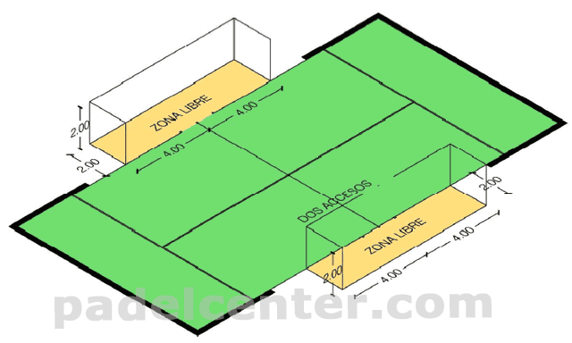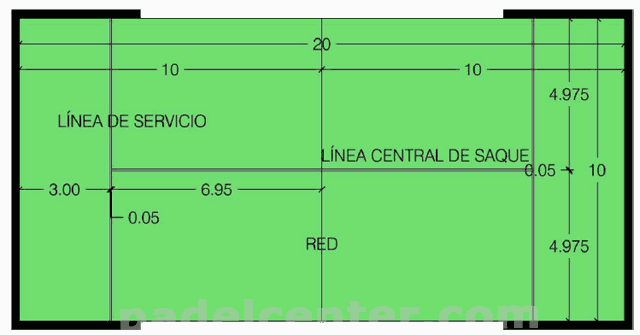 DIMENSIONES El área de juego es un rectángulo de 10 metros de ancho por 20 metros de largo (medidas interiores) con una tolerancia de 0.5%. Este rectángulo está dividido en su mitad por una red. A ambos lados de ella, paralelas a la misma y a una distancia de 6,95 m están las líneas de servicio. El área entre la red y las líneas de servicio está dividida en su mitad por una línea perpendicular a estas, llamada línea central de saque, que divide esta área en dos zonas iguales. Todas las líneas tienen un ancho de 5 cm.