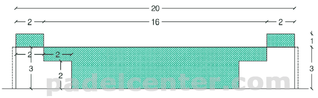 CERRAMIENTOS La pista está cerrada en su totalidad, por fondos de 10 metros de longitud interior y por laterales de 20 metros de longitud interior. En todos los cerramientos se combinan zonas construidas con materiales que permiten un rebote regular de la pelota y zonas de malla metálica donde el rebote es irregular, de la siguiente manera: