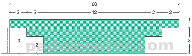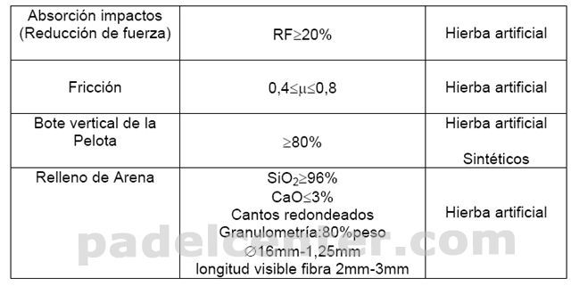Si se utilizase malla electrosoldada todos los puntos de soldadura deben quedar protegidos tanto en el interior de la pista como en el exterior, de modo que no puedan producir cortes o arañazos. Si la malla electrosoldada no está entrelazada y su montaje se hace de forma cuadrada, no romboidal, los hilos de acero paralelos al suelo deberán quedar en el interior de la pista y los verticales en el exterior. Si la malla fuese de simple torsión los tensores deberán colocarse en el exterior de la pista y también convenientemente protegidos. Las uniones o cosido entre los rollos de malla no deben presentar elementos punzantes. Tanto la malla electrosoldada como la de simple torsión deberán formar una superficie plana y vertical y mantenerse de tal modo que estas características no se pierdan. SUELO La superficie de la pista podrá ser de hormigón poroso, cemento, materiales sintéticos o césped artificial, siempre que permita el bote regular de la pelota y evite el encharcamiento. El color podrá ser verde, azul o pardo-terrroso. El pavimento tendrá una planeidad tal que las diferencias de nivel interiores sean inferiores a 3mm medidos con regla de 3m (1/1000). En pavimentos no drenantes las pendientes de evacuación máxima transversal serán del 1% y siempre hacia el exterior de la pista. Para Campeonatos Oficiales o Torneos incluidos en el Calendario Oficial de la Federación Española de Pádel, se exige que el suelo esté recubierto de césped artificial o moqueta y que el suelo no tenga pendientes de evacuación. Los pavimentos sintéticos y de hierba artificial cumplirán los siguientes requisitos conforme con el Informe UNE 41958 IN “Pavimentos deportivos”