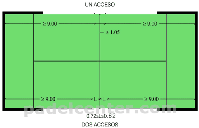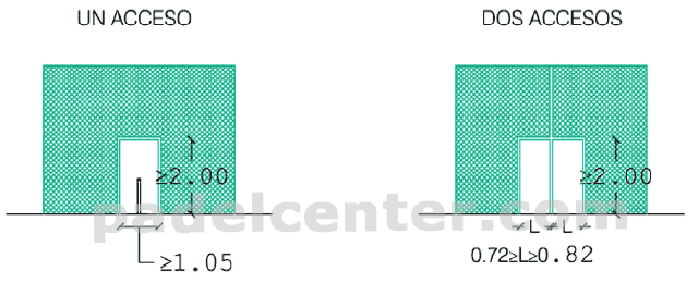 ACCESOS Los accesos a la pista son simétricos respecto al centro de la misma, estando situados en su/s lateral/es. Podrán existir 1 ó 2 aberturas por cada lado, con o sin puerta (ver regla 15 del juego). Las dimensiones de las aberturas deben ser las siguientes: 1. Con un solo acceso por lateral: el hueco libre ha de tener un mínimo de 1,05 x 2,00 metros. (Ver figura). 2. Con dos accesos por lateral: cada hueco libre ha de tener un mínimo de 0.72 x 2.00 metros y un máximo de 0,82 x 2,00 metros. (Ver figura). Nota: Las instalaciones de uso público han de cumplir la normativa de accesibilidad y supresión de barreras arquitectónicas para personas con movilidad reducida.