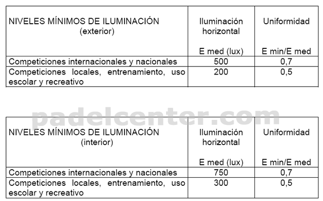 La distancia mínima entre la pared del fondo y la cara más próxima de la abertura será de 9 metros. En caso de existir puertas, las manillas de estas deben estar colocadas por el exterior de la pista, sin que existan resaltes hacia el interior. ILUMINACIÓN La iluminación artificial será uniforme y de manera que no dificulte la visión de los jugadores , del equipo arbitral ni de los espectadores. Cumplirá la norma UNE-EN 12193 “Iluminación de instalaciones deportivas” y contará con los siguientes niveles mínimos de iluminación: