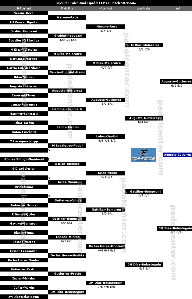 Auguste-Gutierrez rompieron la racha de los número uno y se llevaron el torneo en una nueva final frente a Díaz-Belasteguin. En cuartos de final, los argentinos Matías Díaz Sangiorgio y Gastón Malacalza logran un resultado explosivo y eliminan a Sebastián Nerone y Gabriel Reca en dos sets: 6/1 7/6. El resto de los encuentros de cuartos fue para los favoritos. De las Heras-Montes dieron gran pelea para caer en dos frente a los número uno. |