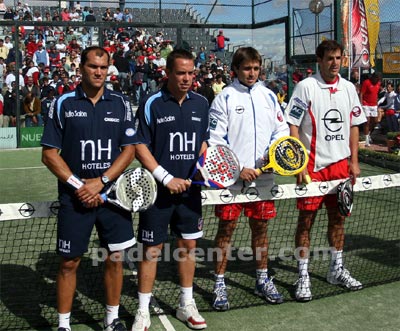 En la pista, los cuatro mejores jugadores del mundo, véase Fernando Belasteguín y Juan Martín Díaz, pareja número uno del mundo; y Gaby Reca y Sebastián Nerone, pareja número dos.