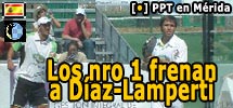 (Mérida, 15 de septiembre de 2007. Antonio Manuel Hidalgo y Redacción de Padelcenter.com) Miguel Lamperti y Matías Díaz se han clasificado para las semifinales del Internacional de Mérida de pádel. Y lo han hecho -es obvio-porque han ganado a sus rivales, Gerardo Derito y Federicio Pérez, pero sobre todo porque en la batalla por la perseverancia, en la lucha por el desgaste del contrario, se han mantenido más firmes fundamentalmente en los compases decisivos del partido. Lamperti y Díaz comenzaron dominando y se adjudicaron el primer set por 6-3. En el octavo juego dispusieron de dos bolas de break. La primera no la aprovecharon y al irse al 40 iguales, Cutu Pérez Millán y Derito daban la sensación de disponer de la suficiente solidez para salvar el apuro. Fue cuando apareció el drive de derecha de Lamperti que, con una bola al fondo de la pista entre sus dos rivales, volvía a ponerles en ventaja. Esta vez remataron el punto y se pusieron 5-3. Sólo era cuestión de mantener su servicio y Lamperti y Díaz supieron hacerlo con mayor facilidad de la esperada porque se anotaron el juego en blanco: 6-3.