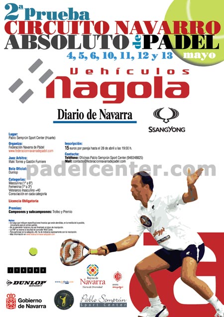 (España, 16 de mayo de 2007, Juan Pablo Pereyra Urdíroz para Padelcenter.com) Finalizó la 2ª prueba del Circuito Navarro de Pádel –Trofeo NAGOLA-SSANGYONG- con la participación de 130 parejas distribuidos en 6 categorías masculinas y 3 femeninas en las canchas del Pablo Semprún Sport Center de Itaroa (Huarte).