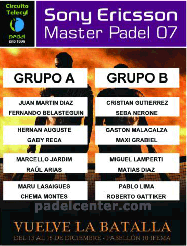 El Sony Ericsson Master Padel 07, que se disputa del 13 al 16 de diciembre en el Recinto Ferial Juan Carlos I, será la última batalla después de una temporada en donde Juan Martín Díaz y Fernando Belasteguín, en categoría masculina, e Iciar Montes y Neki Berwig, en femenina, han extendido su hegemonía.