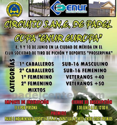 (España, 11/6/2007, Claudio Bobadilla para Padelcenter.com) El pasado fin de semana se realizó en las instalaciones del Club Tiro de Pichón y Deportes Proserpina de Mérida, el Primer CIRCUITO S.A.N.E. COPA ENUR EUROPA.