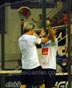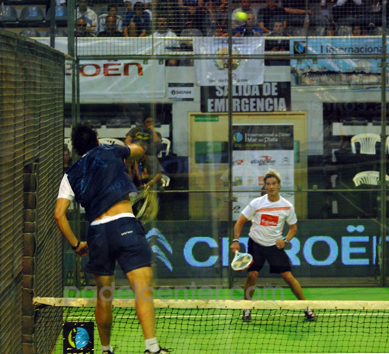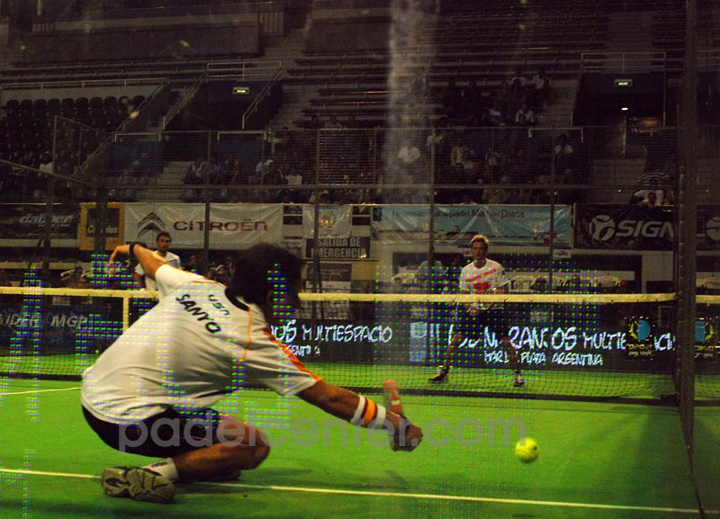 Un partido que crecía en intensidad y sacrificio y ponía suspenso como para contrastar con aquél comienzo abultado, falso presagio de pan comido. El pan se puso duro para Mati y Miguel, y llegaron al tramo final del segundo parcial para sacar con desventaja de 5-6. Los cuatro eran pura concentración y Matías seguía metiéndose para atacar en cada bola que le quedaba a media altura. En el coqueto Polideportivo marplatense, ya había olor a tie break. Palo de Matías, pega sobre el techo del alambre de tres metros y baja afuera, donde Sanyo remata en forma soberbia sobre la red rival. Ovación. Y dudas. Porque si se hubiera jugado con reglamento local, el punto se habría cortado al pegar la bola allá arriba. Rueda Poggi por segunda vez en el partido, a lo Rambo, pero no puede hacer valer su esfuerzo. Es tie break. Mucha actitud de Poggi para arrancar 2-0. Sanyo devuelve mal y Miguel recupera un punto. Saca 2-1 Fernando. Sanyo se desdobla y con su compañero se arrastran en cada bola. Saca Poggi 3-1. La bola siguiente mejor no la contamos. Le pifiian todos, nadie le pega con el centro, y Miguel termina estrellándola contra el vidrio. 1-4. Poggi pega y descarga en un festejo gritado toda la ansiedad que acumuló desde el 0-1 allá por el primer set. Fernando falla y volea al alambre (la malla, dirán en España). 5-2 y saca Sanyo. Vuelve a pegar la Torre, otra vez con salto y es 6-2. Set point. El público ya ganó porque el partido ya es otro. Poggi pega plano y ahora Miguel se agranda y contragolpea por el fondo. 3-6 saca Miguel, con sobrevida. Se equivoca Sanyo y la deja colgadita, Mati no perdona. 4-6. Pega Miguel, algo defectuoso, pero la puerta traiciona a Sanyo que esperaba allí, y ahora saca Poggi 6-5. Terrible Lamperteada de Poggi subiéndose atrás de Sanyo. "Míaaaaa!", y el grito no desentona con el tremendo palazo que sirve para cerrar la discusión del segundo set. Ahora están iguales, como al principio, y con final abierto.