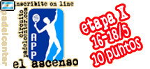 (Buenos Aires, 17/5/2008. De la Redacción de Padelcenter.com) Otro gran evento ocupa las canchas de La Eskina de Olivos del 16 al 18 de mayo, coincidiendo la etapa X del Ascenso por 10 puntos para el Ranking APP y la etapa IV del APP-Femenino por 100 puntos para el Ranking APP, ambos en el marco de los Circuitos Padelcenter.com auspiciados por Grupo.Padelcenter, Mixer Padel y Extreme, bebida oficial.