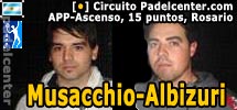 (Buenos Aires, 28/4/2008. De la Redacción de Padelcenter.com) Desde Pergamino, Musacchio/Albizuri se quedan con la etapa IX del Circuito Padelcenter.com, el Ascenso de la APP, en su primera etapa fuera de Buenos Aires, disputada en Rosario por 15 puntos para el Ranking APP.